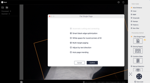 “Flat single page” processing method is suitable for document scanning. Put the document on the black mat randomly, the build-in features of the system will recognize the scanned target and do auto-cropping and correct the tilt.