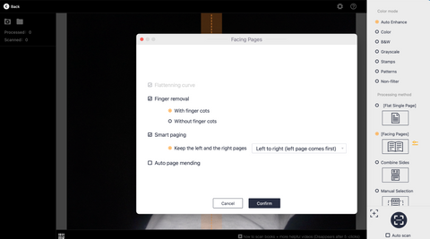 The “Curve-flattening technology” and “Finger removal” feature will automatically flatten the curvature in the middle, and the system will eliminate the finger shadow. You can get two separate, flat pages under this scanning method.