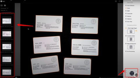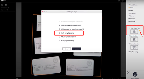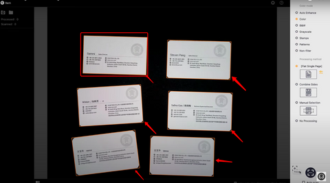 Put the photos, stamps, cards that need to be scanned on the black mat, the system will automatically detect multiple objects and frame selection. Just click the “Scan” button once, the system will identify each object individually and generate multiple separate scanned files.